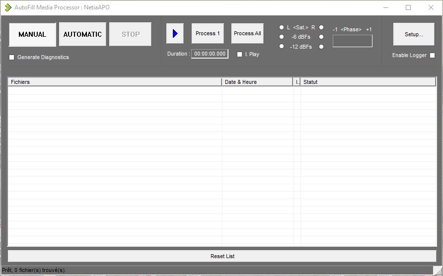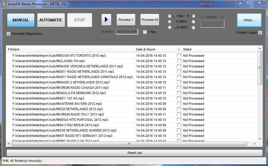 En mode automatique, Autofill enchaîne les opérations de traitement et d'insertion dans la base de données de façon continue et sans intervention. L'application traite les fichiers pour les convertir en fonction des besoins, en corrigeant éventuellement les niveaux sonores et en ajoutant automatiquement les métadonnées associées dans la base de données de Radio Assist.