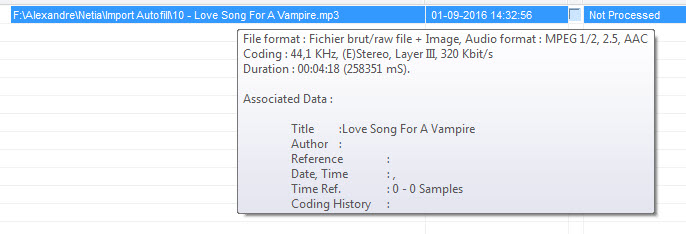 Remplissage automatique de la base avec les métadonnées associées quand elles existent (ex : Broadcast Wave Format, BWF).