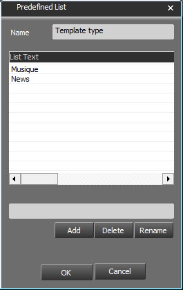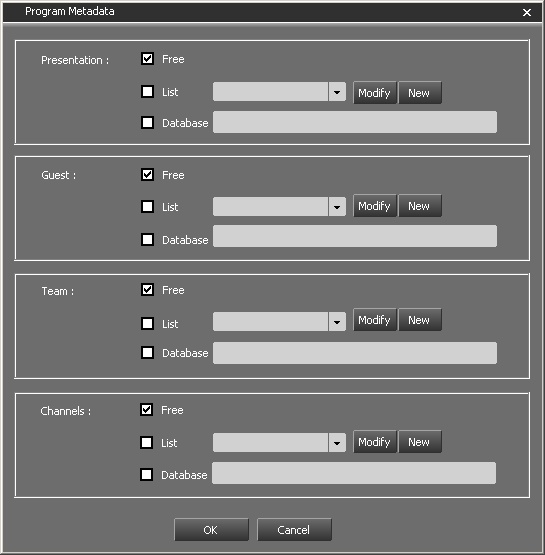 Cette fenêtre permet de définir les métadonnées pouvant être associées aux émissions. Pour ces 4 types de métadonnées (Presentation/Guest/Team/Channels) 3 choix sont proposés :