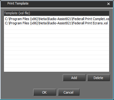 Si aucun format d’impression n’est renseigné, les deux formats par défaut seront proposés. Les formats d’impression par défaut sont situés dans le dossier d’installation de Radio Assist, il s’agit de Federall Print Complet.xsl (impression des émissions, écrans et pas), et Federall Print Ecrans.xsl (émissions et écrans). Si un ou plusieurs templates sont renseignés, les templates par défaut ne sont plus proposés dans Federall. Si un seul template est renseigné, il sera utilisé par défaut.
