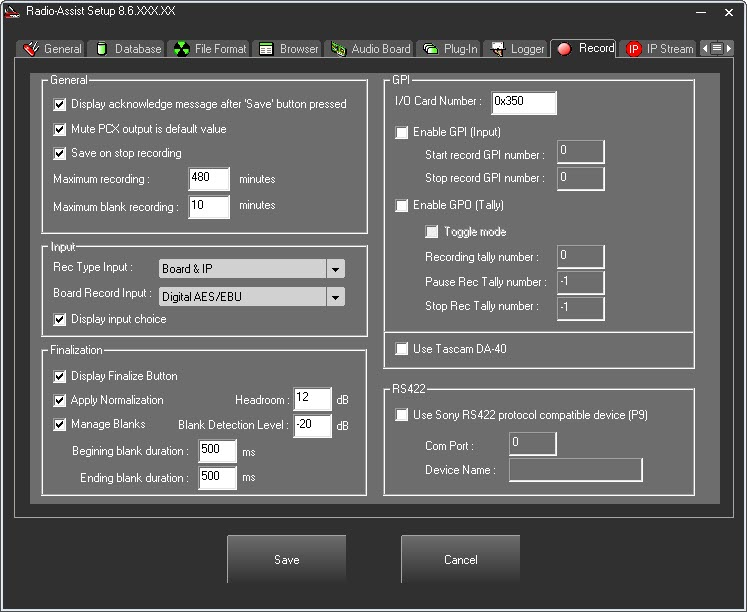 Onglet Record : gestion des paramètres de configuration de l’onglet Enregistrement.