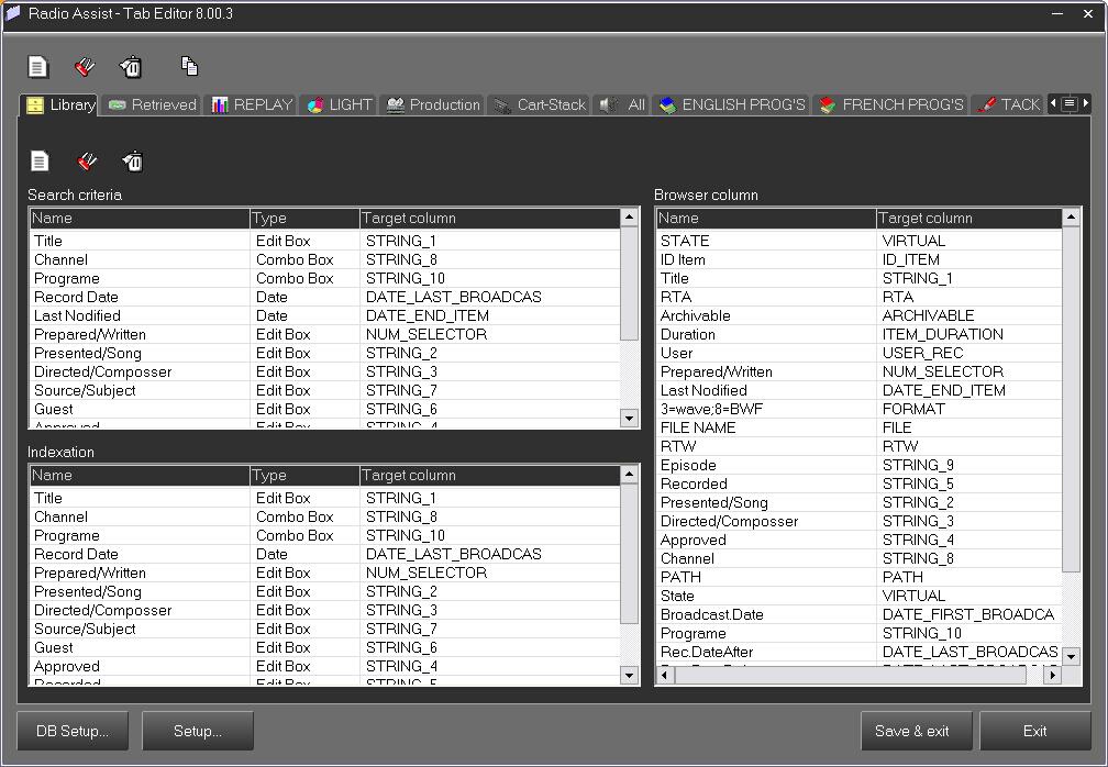 Opening request by default : Requête à exécuter à l’ouverture de l’onglet dynamique de type SELECT. Ce champ peut rester vide. Au besoin, on peut spécifier dans ce champ une clause SQL, qui apparaîtra dans la clause WHERE d’une requête de type SELECT. Exemple: STRING_3 LIKE ‘Sport’. Cette clause sera donc utilisée automatiquement par le browser RadioAssist lorsque l’onglet dynamique sera sélectionné. Dans cet exemple, le browser effectuerait une requête du type « SELECT … FROM T_ITEM WHERE … AND STRING_3 LIKE ‘Sport’ » pour afficher les éléments appartenant à l’onglet. |