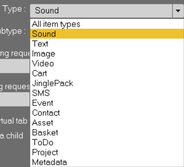 Item type : Sélection du type d’éléments que l’onglet doit gérer (au niveau matière associée). ![]() Sound, Text, Image, Video : Type d'éléments physiques pouvant être diffusés. Cart, Jingle Pack : Type d'éléments utilisés pour regrouper les éléments à diffuser. SMS, Event, Contact : type d'éléments spécifiques (Obsolète). Asset, Basket, To Do, Project : Type d'éléments utilisés dans Media Assist. Metadata : Type d'éléments utilisés pour créer des éléments de type métadonnées afin d'ajouter plus de métadonnées à un écran dans Radio Assist. |